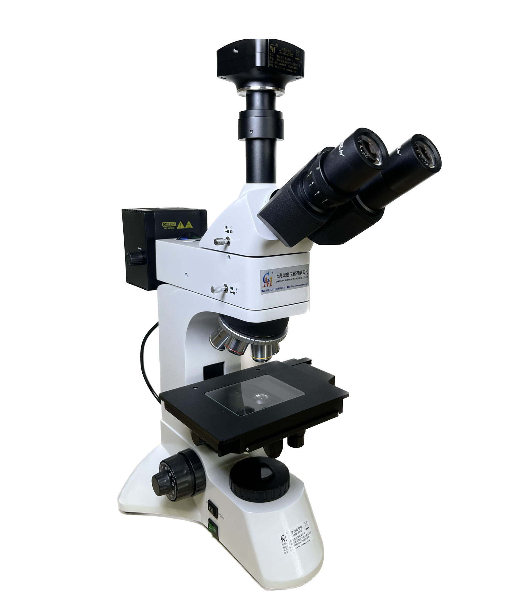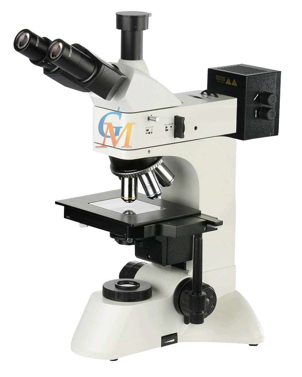 - 三目鏡筒,可自由切換正常觀察與偏光觀察,可進行100%透光攝影。