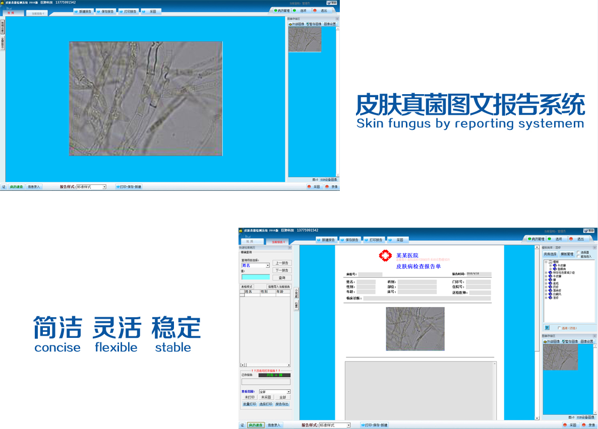 ○皮膚真菌檢測系統軟件通過連接醫用顯微獲取其影像、圖像信息,實現影像信息在工作站端的同步顯示,從而進行圖像采集,形成圖文診斷報告,實現病人的文字、圖像、影像資料的管理、查詢、統計等功能。